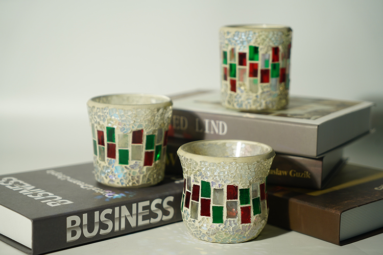 High quality mosaic finished color spraying glass jar , lots of different size and shape.Make your candle collection stand out with this stunning product. Having trouble choosing a color? Try the vessel sample pack the perfect way to experience all of our colorways in one convenient package!