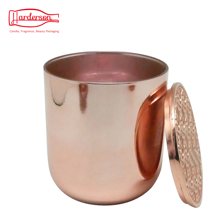 Classic designed electroplate rose gold candle jars with zinc alloy metal lids. Permanently laser engraved inside for the highest quality finish of metallic candle holders. The mouth-blown glass jars have an elegant thin glass rim. Curved glass bottom features a high-end modern luxury.