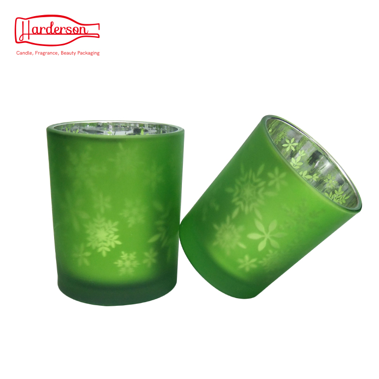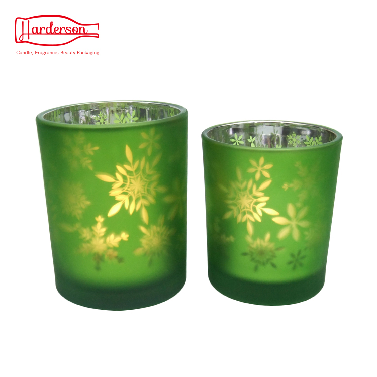 The glass candle holders is sprayed by green outside, the second process is internal electroplating technology,then laser engraving is applied to form snowflake pattern, . you can also use them as wax filled candle jars,it can be washed and reused when candles burn out, as a storage jar, It gives a nice, cozy and warm feeling.