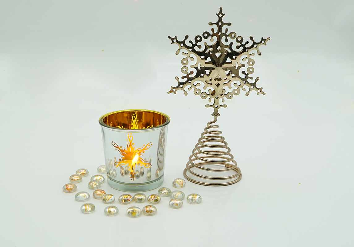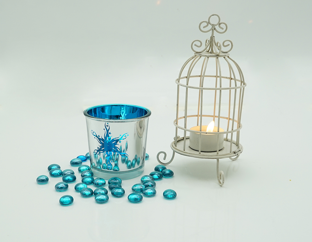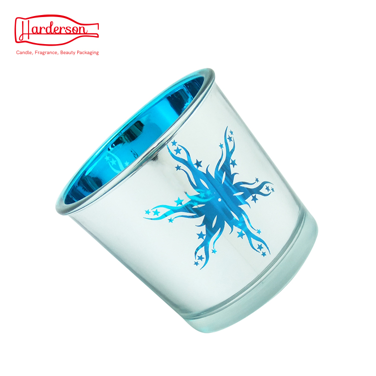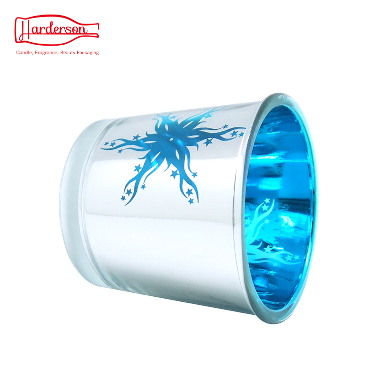 Classic designed electroplate Shiny Silver with blue & gold spray candle jars, permanently laser engraved inside for the highest quality finish of metallic candle holders. The machine blown glass jars have special and beautiful snow style feature.