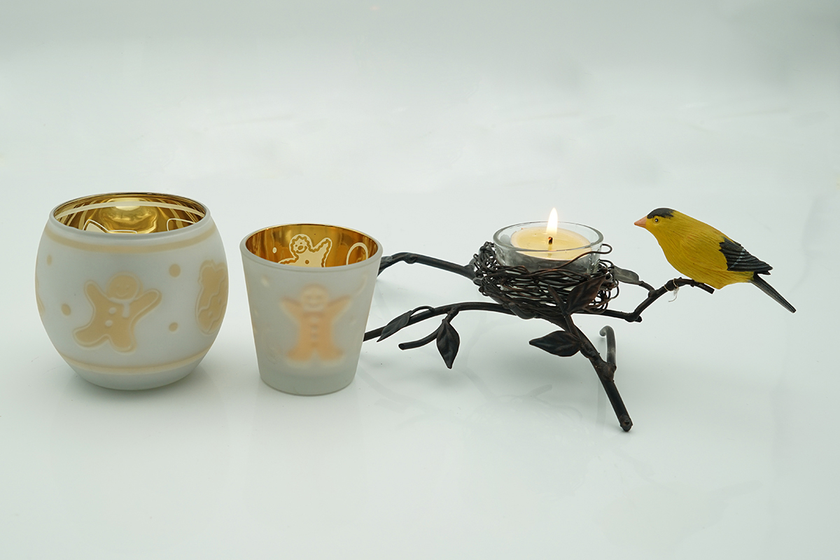 Create the perfect ambiance. Candlelight flickers through the geometric laser cut patterns on Shiny Gold with lovely doll style pattern candle holders. Light up your bedroom or add the perfect touch of warm light to your living room.