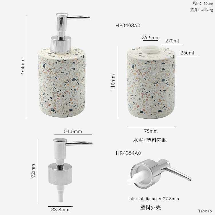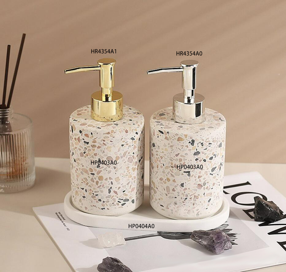 The bathroom set are including the bottles & plate set. 2bottles are made with terrazzo material in cylider shape which is modern and high quality. Plastic internal bottle designed which can meet the leak proof function. Silver & gold electroplating pumps which shows nobility. White concrete plate in oval shape is the good helper for organization and store for your house keeing in your bathroom.