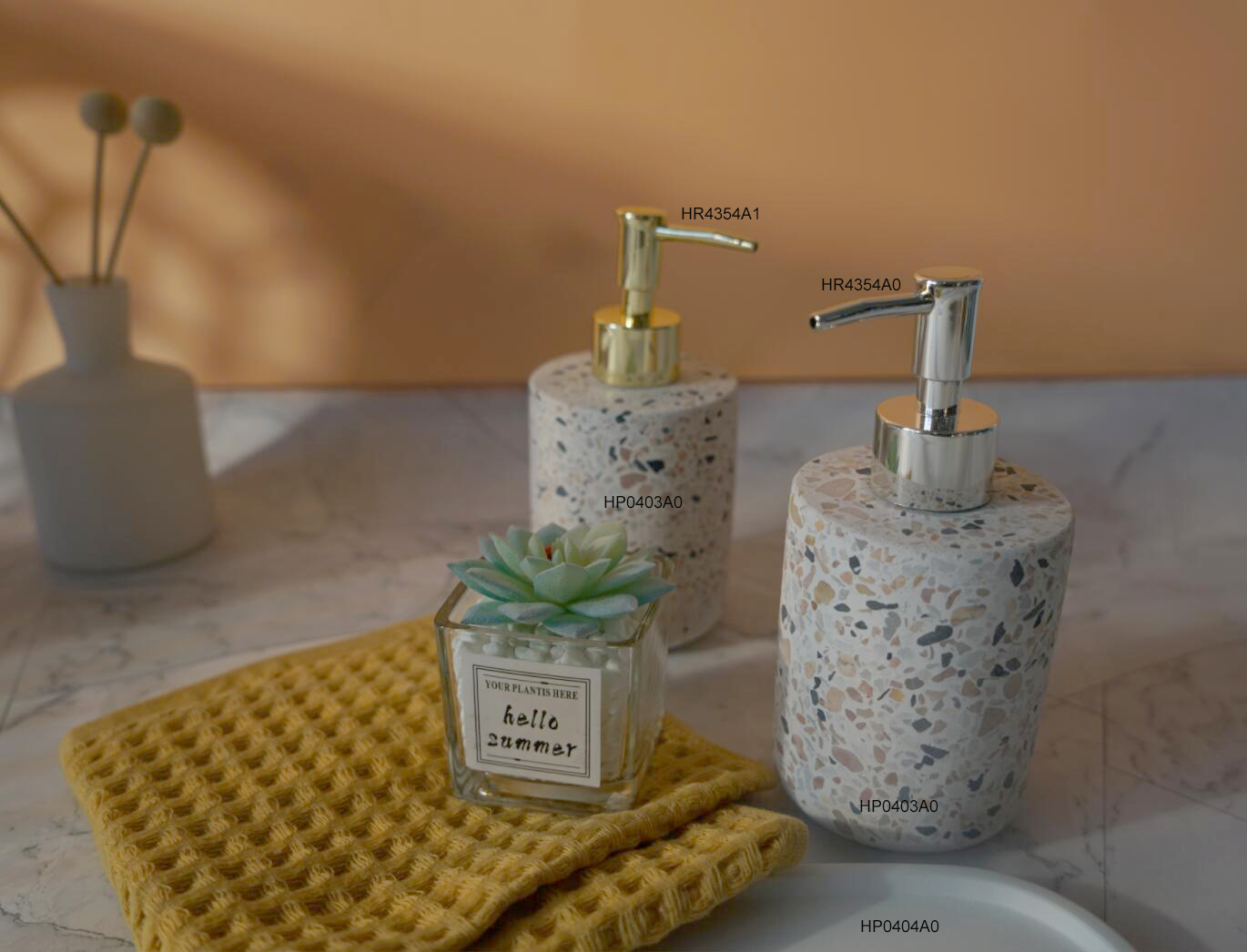 The bottles are made with terrazzo material in cylider shape which is modern and high quality.