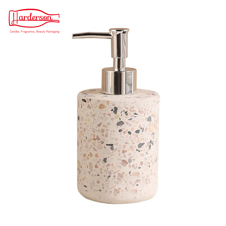 Wholesale Harderson high quality round shape terrazzo bottle with plastic internal bottle and concrete plate set for bathroom accessory