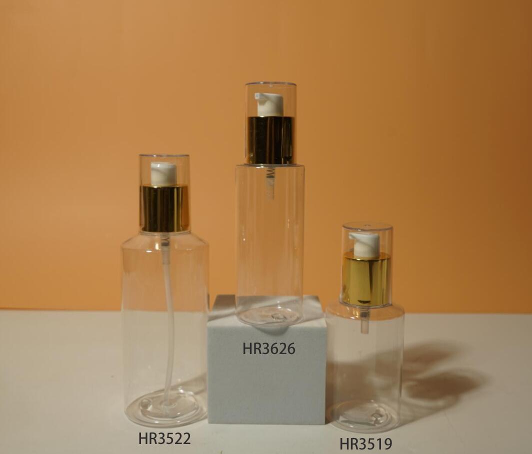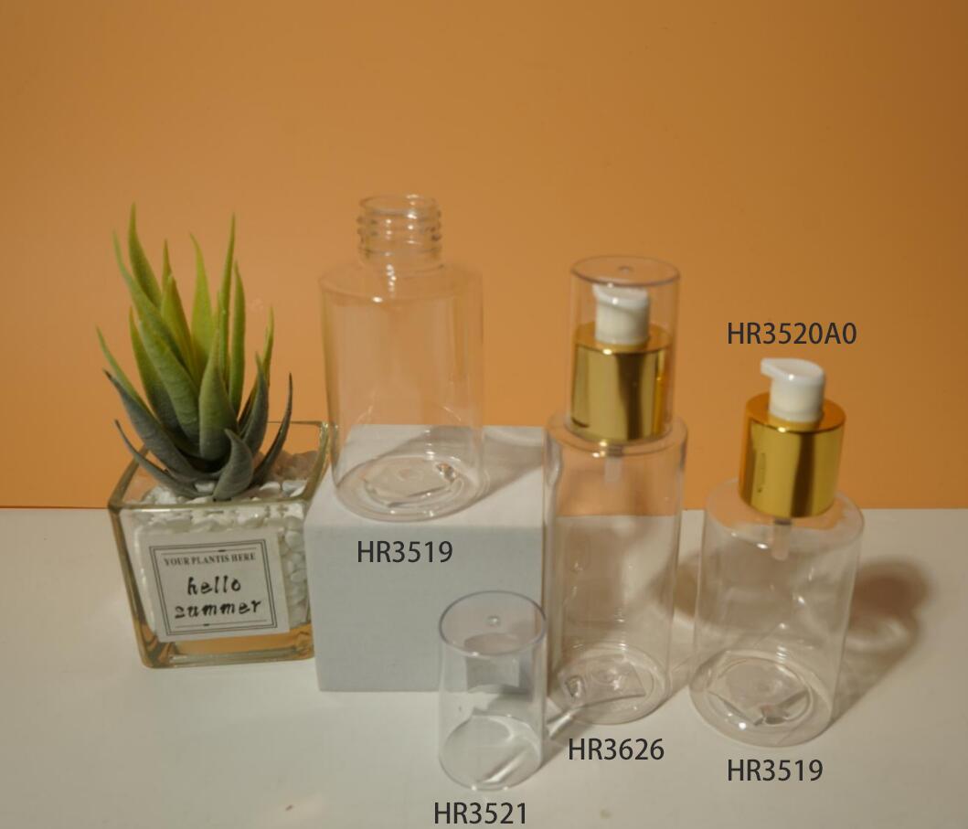 The recycled plastic bottle is in clear & white injection PET quality, color, deco finish & logo can be customiezed. Cylinder shape body with flat shoulder & slanted shoulder for your selection. Gold pump with clear cover which is neat and luxury. It can pair with different closures such as dropper, mist sprayer pump, lotion pump, cap for different functions.