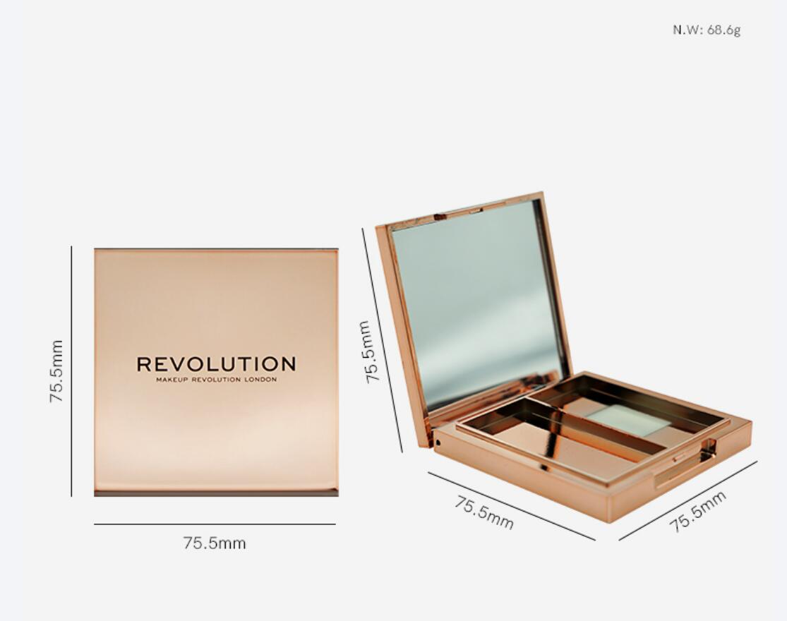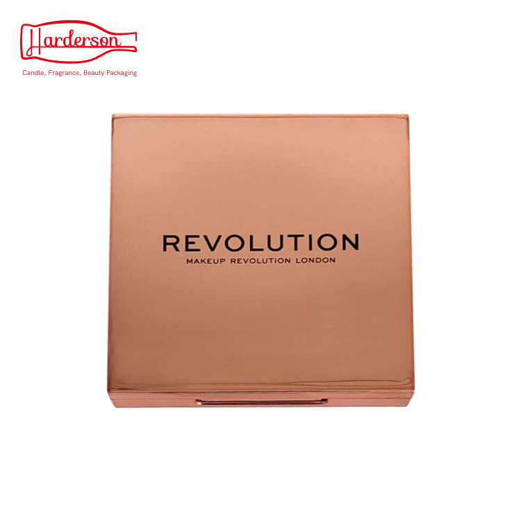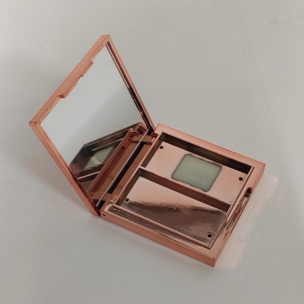 The plastic makeup packaging is applying with electroplating rose gold finish & silk screen printing logo at the top cover which is luxury, it speaks for beauty. Square shape, snap button sealing construction + 2pans + mirror design which is convenient for daily use. It’s a must-have cosmetic makeup product for a beauty bag.