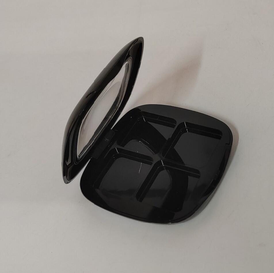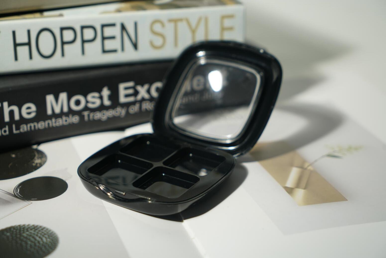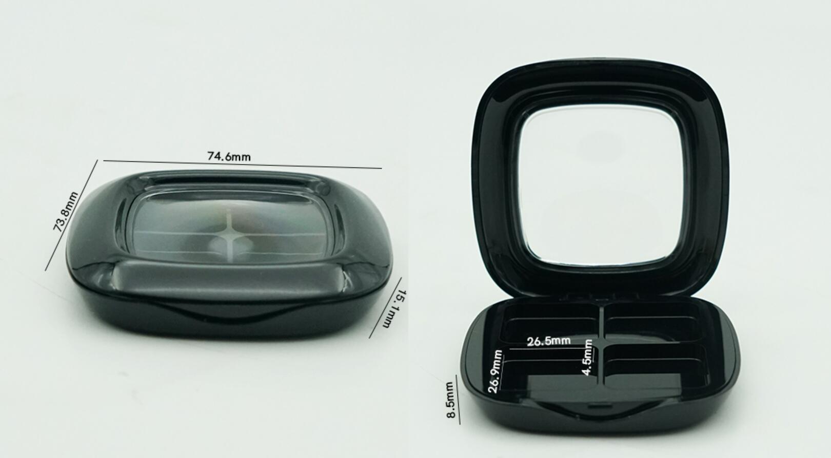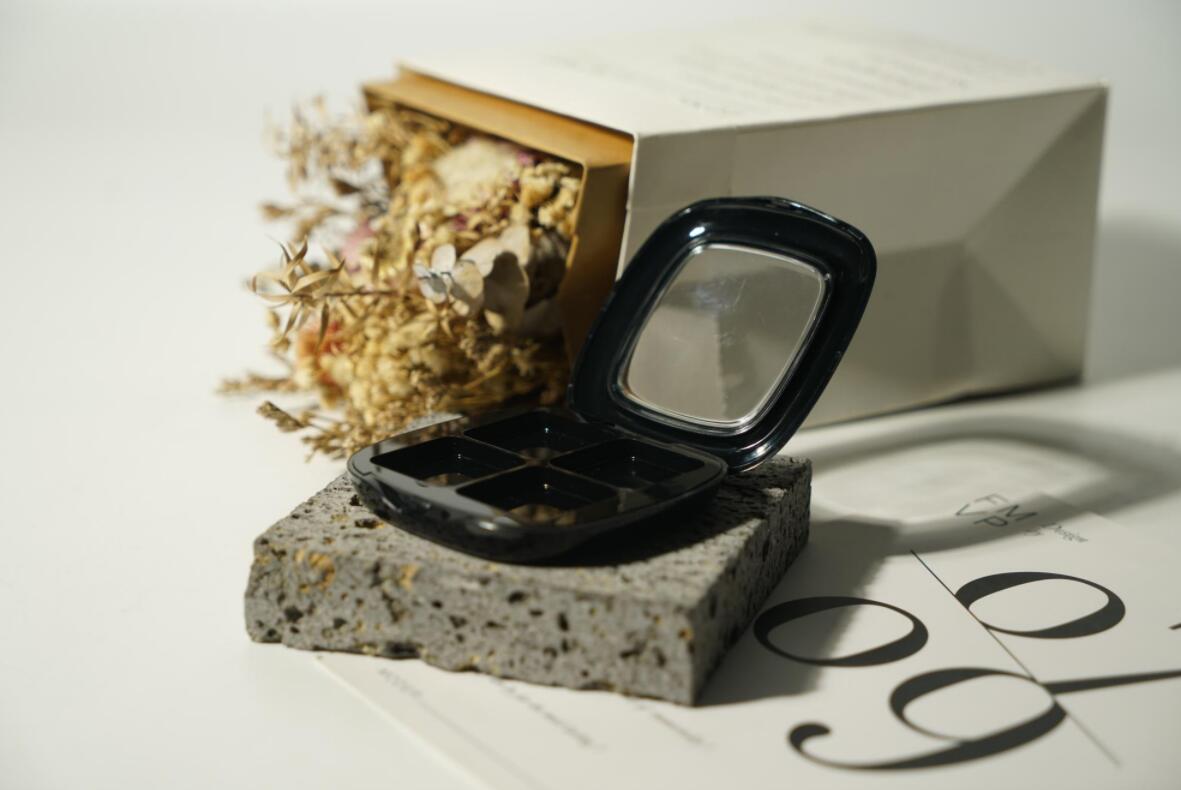 The recycled plastic eyeshadow palette is applying with color injection in black which is neat & simple, classic & elegant, custom service is acceptable. Square shape with round corners smooth lines & windows roof design which is easy to show the appearance of powder compact as well as be convenient to identify the color of the powder compact for daily use. 4colors pans with more color choice. It’s a must-have cosmetic makeup product for a beauty bag.