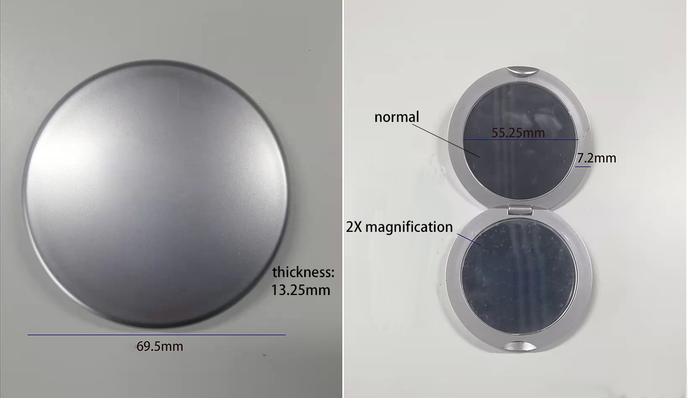 The plastic mirror case in round shape, mini size, double-sided mirror which with one normal mirror and the other is 2X magnification function. It’s portable and convenient for daily use.