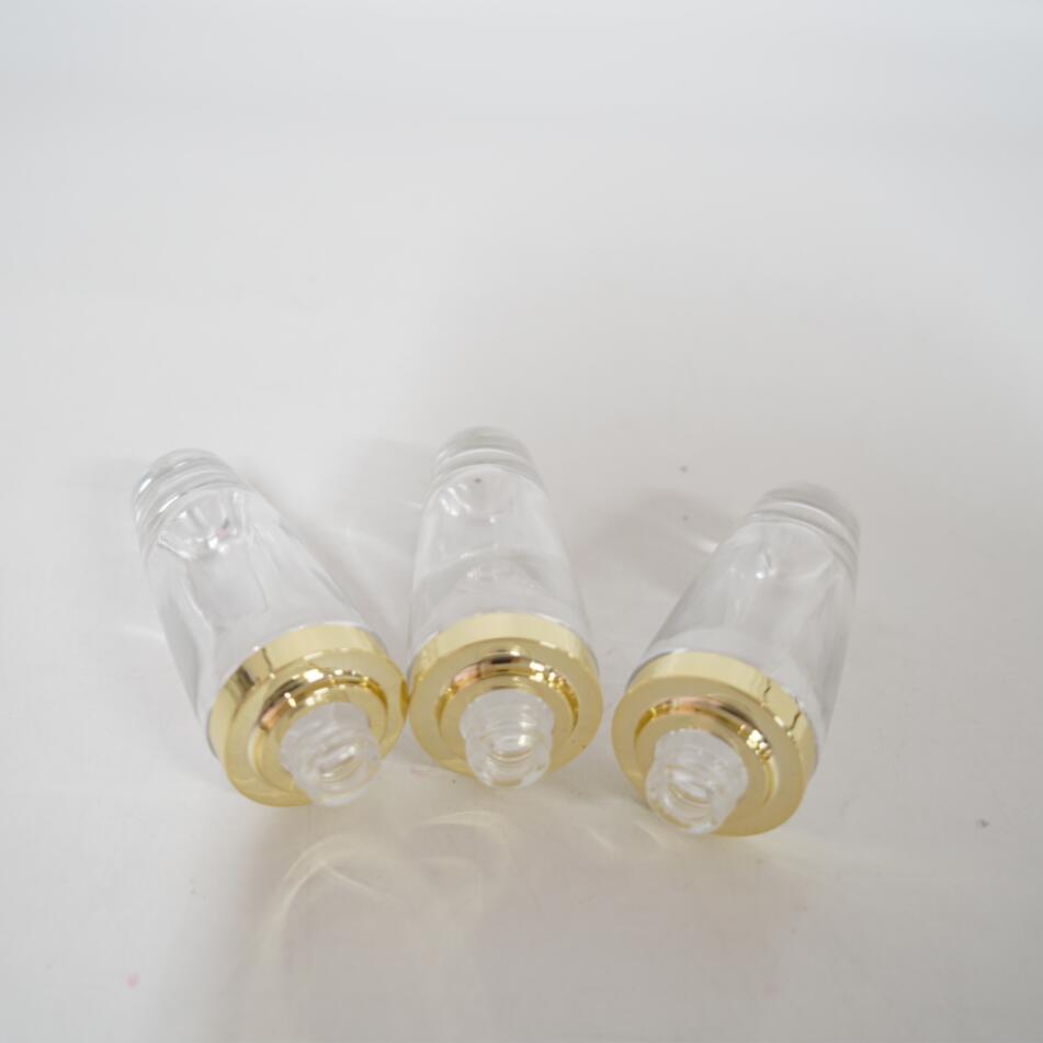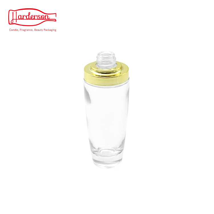 The glass bottle is in curve shape body with gold shoulder holster which design is so special.