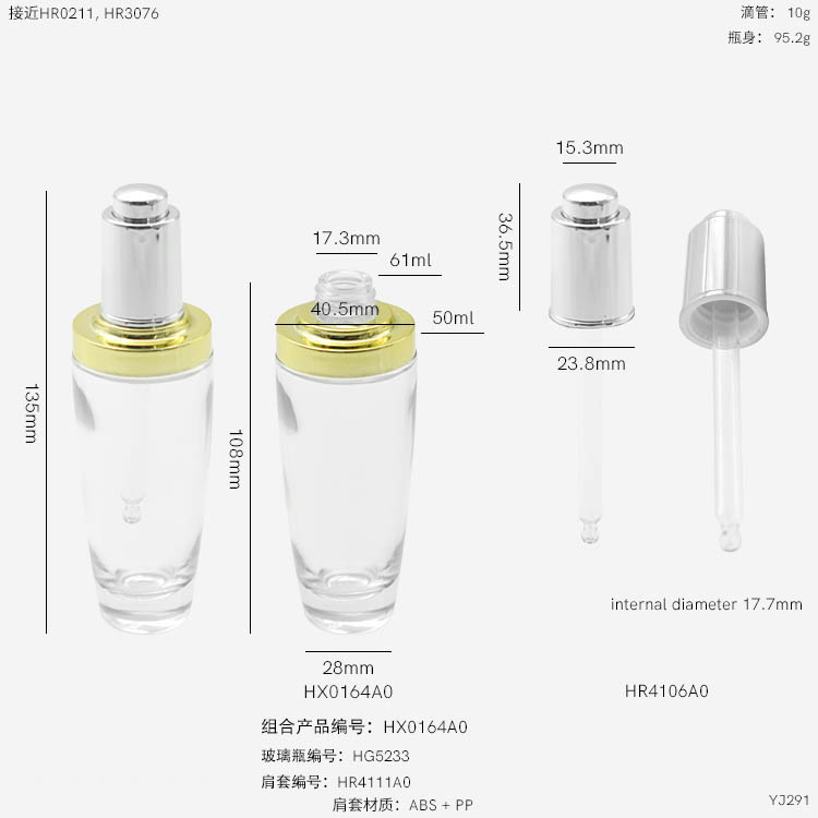 The glass bottle is in curve shape, high transparency in high quality, color, deco finish & logo can be customiezed. Curve shape body with gold shoulder holster which design is so special. Silver dropper makes the appearance so luxury. It’s a good packaging soluction for the skincare, cosmetic, personal care products.