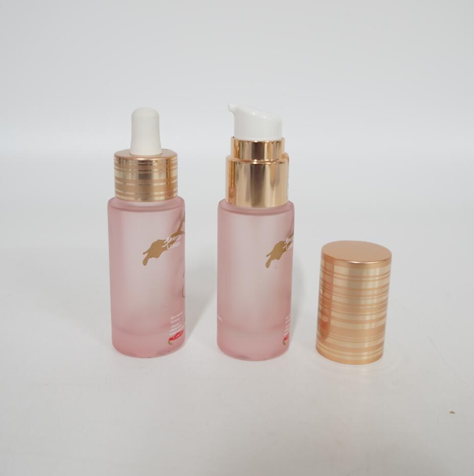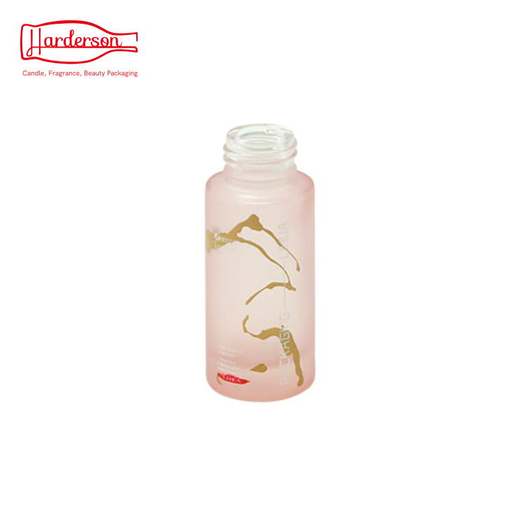 The glass bottle is applying with pink color over spray + frosted finish with silk screen printing logo, color, deco finish & logo can be customiezed. Cylinder shape mini body which is portable. It pairs with gold dropper or pump with cap decored with stripe patterns which makes the appearance so luxury. It can apply with different closures for different functions.