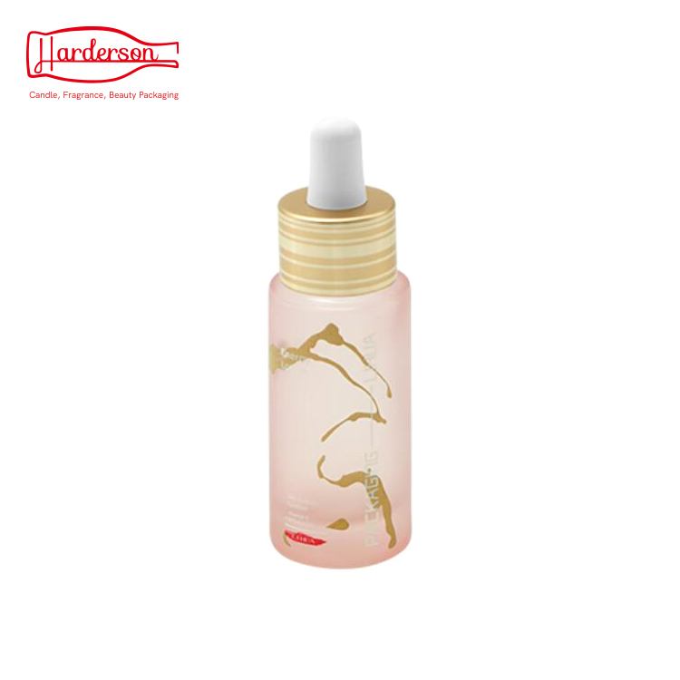 Wholesale Harderson high quality 30ml cylinder shape glass cosmetic bottle color over spray + frosted + silk screen printing logo with gold dropper or pump + cap for essential oil serum lotion